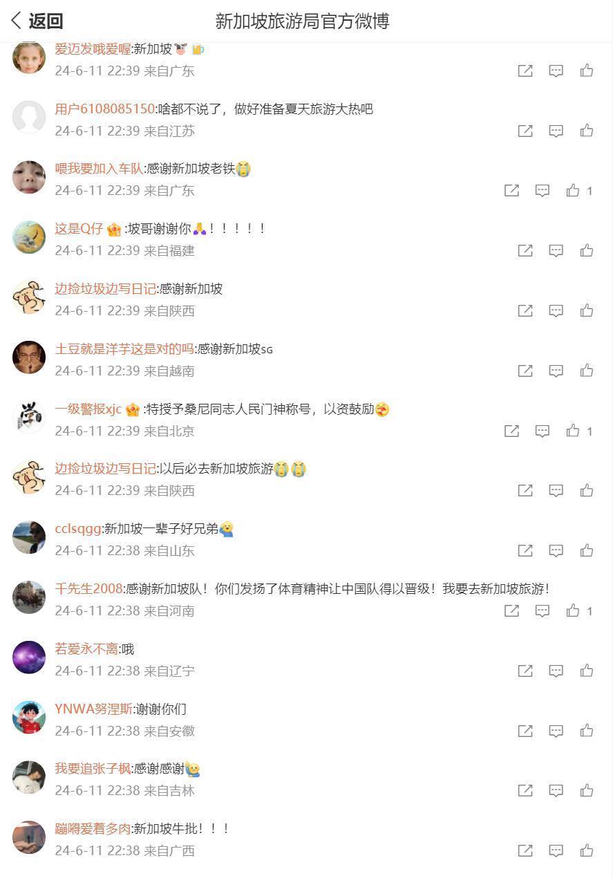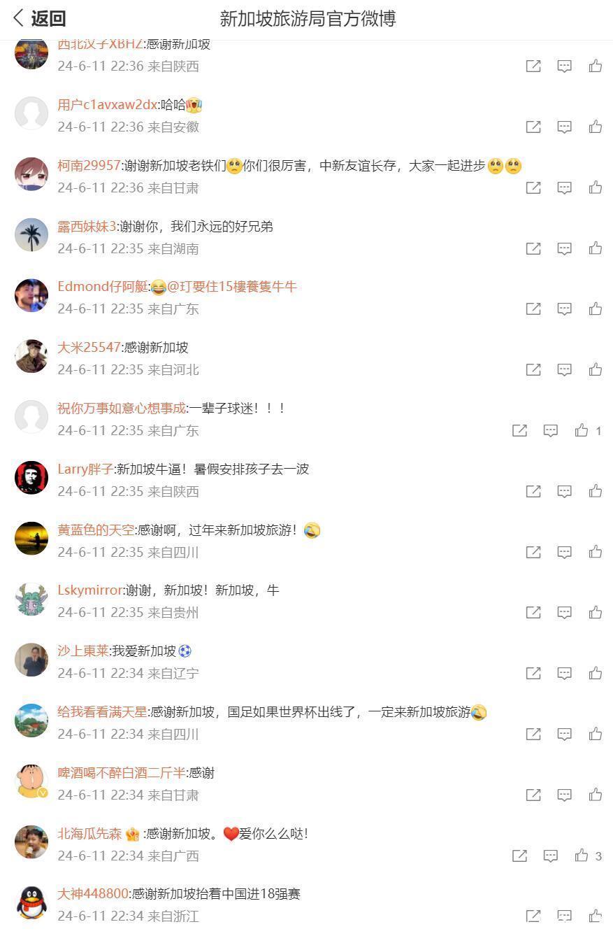 这场比赛,新加坡队踢得极度武断,几次看上去齐要崩了,但最终即是莫得丢第四球。赛后,球迷们刷爆了新加坡旅游局的官方微博,对新加坡抒发了感谢,传颂新加坡是好兄弟!还有球迷捉弄,新加坡多了14亿球迷。