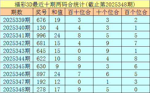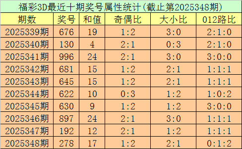 开奖归来:第2025348期福彩3D奖号为278。奖号边幅为组六,大小比为2:1,和值为17,奇偶比为1:2,012路比为0:1:2,跨度为6。