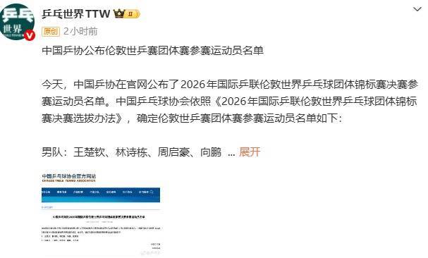 今天(4月8日),中国乒协在官网公布了2026年外洋乒联伦敦世界乒乓球团体锦标赛决赛参赛表现员名单。中国乒乓球协会依照《2026年外洋乒联伦敦世界乒乓球团体锦标赛决赛收受宗旨》,笃定伦敦世乒赛团体赛参赛表现员名单如下: 男队:王楚钦、林诗栋、周启豪、向鹏、梁靖崑 女队:孙颖莎、王曼昱、陈幸同、蒯曼、王艺迪 樊振东动作第十五届世界表现会乒乓球技俩成年组男单冠军,依据收受宗旨可成功入选。中国乒协就参加伦敦世乒赛团体赛事宜,主动征询樊振东本东谈主见地。樊振东暗意因个东谈主原因自觉解除伦敦世乒赛团体赛的参赛经验。 中国队男团气势中,王楚钦和林诗栋成功入选,通过队内收受赛打出来周启豪和向鹏两个限额。男队主评释王皓先容终末一个参赛限额时说:“经评释组集体沟通,并纠合得到限额的表现员和关系人人的见地,笃定第五个参赛表现员为梁靖崑。梁靖崑活着乒赛和亚锦赛上的教训、自若性、要道场次的进展全球有目共睹。诚然从旧年亚锦赛阻挡后受到伤病困扰,收成不算很好,可是跟着伤病康复,情状也在回升。信托背面再通过20多天的备战,梁靖崑可以颐养到最佳的情状去迎接世乒赛。 团体赛比得是痛恨和团队凝华力。王皓先容说:“王楚钦刚得到世界杯单打冠军,他的情状和精神神志皆保抓得很好。在得到世界杯冠军后我和他说,接下来要把全球凝华在沿路,团队的魂凝华起来。林诗栋前一阵出现了伤病,近期收复得相比好,队列派他去参加了太原老例挑战赛,通过比赛找嗅觉。周启豪动作一个宿将,能收拢此次收受契机得到参赛经验实至名归,接下来最主要的是颐养备战世乒赛情状,思好活着乒赛中怎样能为球队作念孝敬。向鹏一直谨小慎微,终末竞争到限额,亦然对他付出的笃信。尽管时代上还有一些要去顾问的问题,但濒临团体赛,接下来要负重致远保证好每一天的备战质料。” 团体赛的征途向来不是一帆风顺,王皓以为:“男线竞争一直很强烈,频年外协会表现员向上很快。不管是成皆世乒赛,还是釜山世乒赛,皆遭受过辛苦的场次。是以动作中国队,莫得冠军是保赢的,等于要去冲击冠军。我信托,在国度需要的时代,咱们每个队员皆会拼尽全力。” 女队五东谈主气势中,孙颖莎和王曼昱成功入选,陈幸同、蒯曼和王艺迪循序通过队内收受入选。女队主评释马琳先容说,“当今参赛气势是女队世界排行最高的五东谈主,体现了女队最高的竞技水平。她们五个东谈主咫尺的竞技情状、求胜空想和参赛信心,皆很可以。” 马琳详解谈:“王艺迪和陈幸同皆参加过两次世乒赛团体赛,这是她们的第三届团体赛了,诚然之前她们上场次数未几,但也蚁合了教训。蒯曼是第一次参加世乒赛团体赛,对她单打实力的覆按会更多。”马琳终末暗意:“团体赛是代表一个国度最高水平的竞争,全队皆会负重致远,作念好伦敦世乒赛的备战。” 男女队字据收受宗旨,有序笃定了10位参赛队员。国度队总评释秦志戬暗意:“从巴黎奥运会后,男队参预新老轮流,外协会竞争方法愈加强烈。男队字据收受宗旨最终笃定的参赛气势,是这个阶段最合理的取舍。尽管从气势举座厚度和敌手方法来看,男队竞争压力比女队大,但我信托,通过集体的悉力,积极的备战,男队可以完成好此次团体赛任务,去冲击、去拼下冠军。 女队参赛五东谈主从举座实力、世界排行,年岁结构来看,皆是最强的。是以濒临伦敦世乒赛但愿她们粗略作念好我方,全力求胜,捍卫荣誉。” 终末,秦志戬说:“伦敦世乒赛是新一届评释组第一次团体赛的覆按,我但愿全队高下,合营一致,完成好备战和参赛任务,为祖邦交上怡悦的答卷。” 起原:乒乓世界TTW微博 ","del":0,"gnid":"934676de63c7b0e13","img_data":[{"flag":"2","img":[{"desc":"","height":"366","title":"","url":"http://p0.img.360kuai.com/t11508c75c89645ca49b4b91e06.jpg","width":"607"}]}],"original":0,"pat":"art_src_1,fts0,sts0","powerby":"cache","pub_time":1775686887000,"pure":"","rawurl":"http://zm.news.so.com/3d963d7eebaf81a5cfb266100551f760","redirect":0,"rptid":"676611b2f7f0803a","rss_ext":[],"s":"t","src":"人人网","tag":[{"clk":"ksport_1:世乒赛","k":"世乒赛","u":""},{"clk":"ksport_1:周启豪","k":"周启豪","u":""},{"clk":"ksport_1:王楚钦","k":"王楚钦","u":""},{"clk":"ksport_1:王艺迪","k":"王艺迪","u":""}],"title":"樊振东自觉解除伦敦世乒赛参赛经验","type":"zmt","wapurl":"http://zm.news.so.com/3d963d7eebaf81a5cfb266100551f760","ytag":"体育:乒球","zmt":{"brand":{},"cert":"人人网官方账号","desc":"全省最大的新闻外宣派系网站坚抓正确的公论导向靠拢活命面向人人","fans_num":99660,"id":"1266166238","is_brand":"0","name":"人人网","new_verify":"9","pic":"https://p0.img.360kuai.com/t11508c75c841ce56173f70928e.png","real":1,"textimg":"https://p9.img.360kuai.com/bl/0_3/t017c4d51e87f46986f.png","verify":"0"},"zmt_status":0}","errmsg":"","errno":0} |